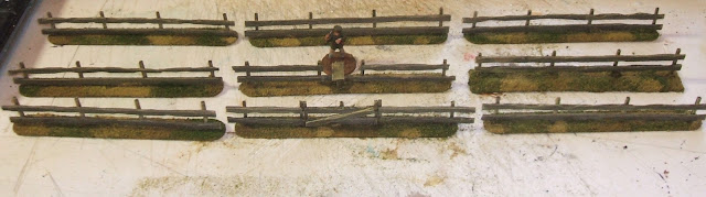 I already have something like twelve feet (3.6m) of fences for 28mm, so why make more? Well, simply put, because the ones Mel makes look a lot nicer than the ones I already had. Besides, who doesn't need 16 foot of model fencing? I can almost feel teh Battle of Farmville approaching.