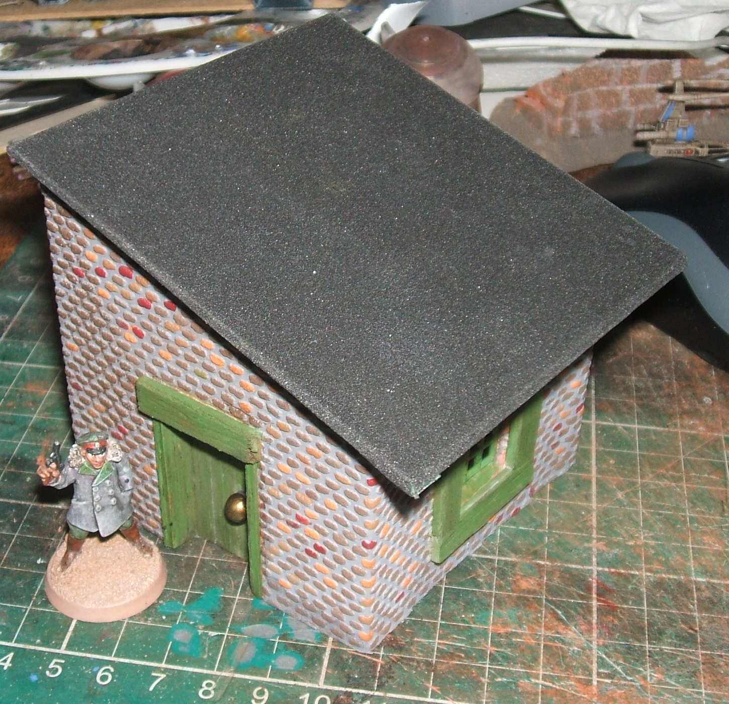 This ended up looking really quite huge next to the model, which is going to inform my choices about scaling in future. Fundamentally, I make doors too big, and that then throws everything else off. The window's a bit skewiff, too. Nonetheless, I'm pretty happy with this. The wallpaper that provides the bricks is just great, although one does seem to spend forever painting it. The roof felt is black sandpaper, and the window is that granny grating stuff. I'm knocking up a few buildings at the minute that have a particular feel to them, on which more in due time. Future iterations will either be smaller or have a chimney, because this thing's so big it could be a cottage. The roofing and brick give a suggestion of period, but aren't too specific, I hope. The doorknob needs to be smaller, too.